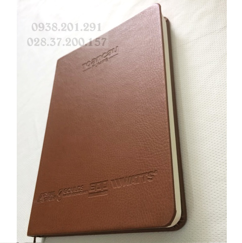 Sổ tay bìa da may chỉ keo gáy có tay cài gài bút màu nâu cam