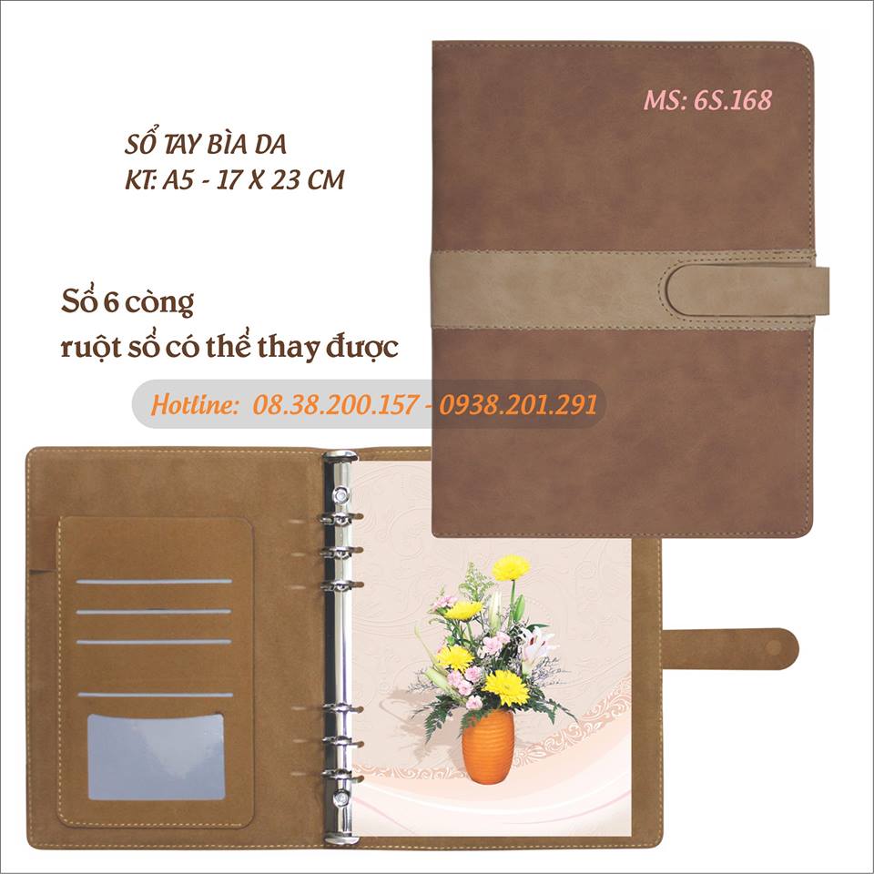 Sổ có gáy còng 6 khoen bằng kim loại, có thể mở ra để thay ruột sổ sau khi dùng hết