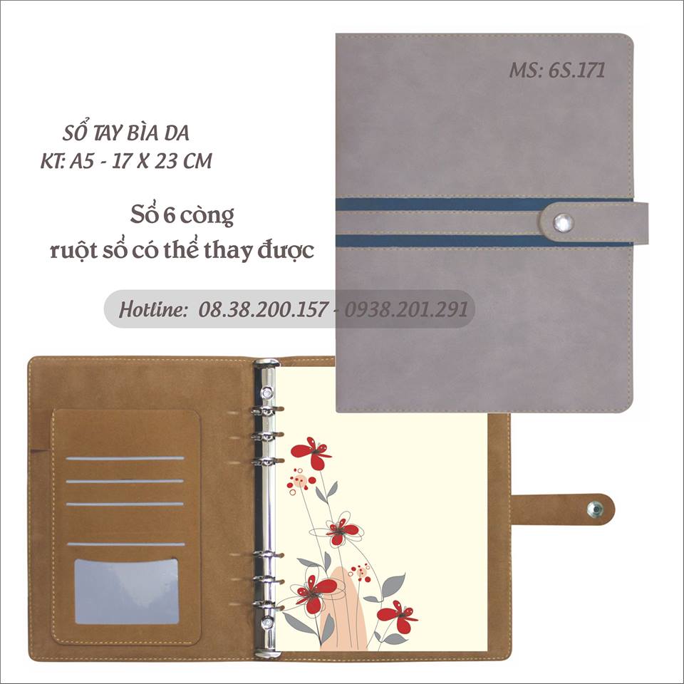 Sổ có gáy còng 6 khoen bằng kim loại, có thể mở ra để thay ruột sổ sau khi dùng hết